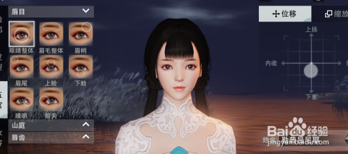 其实搞定脸型,我们 的捏脸的一半就好了,眉毛我没有特意去修改,眼睛的话,中间的间距就按默认的即可,但是最旁边的眼角(我建议大一点)嘴巴我把上下都拉开了一点,这样感觉在笑。