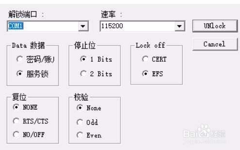 4.选完后点击“UNlock”按钮,等程序运行检测写入清除完成.提示"恭喜!密码/账户锁已清除"