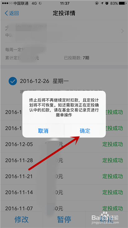 系统会提示你,如果确定之后,今后不会再扣款,也就是在指定的日子不会让你定投了,我们点击确定即可。