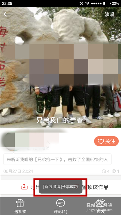点击之后,只要界面的下方显示出分享成功的字样,就代表我们完成了操作,接下来你就可以去你的微博收听你演唱的曲目了。