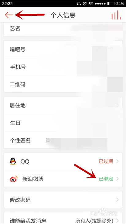 进入之后,就有我们的用户名生日年龄等等,在最下方,有一个与其他软件的相关。如果你没有设置过,那么就按照提示点进去操作就可以了。如果是好久不用,那么一定会提示你已过期,我们同样需要重新激活,我们要分享到新浪微博,那么就在那里点击一下。