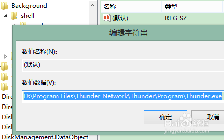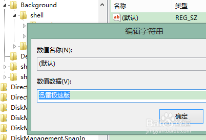 随后,选中新建的子项(我这里是XunLei),在右边窗口中双击“默认”两个字,弹出编辑窗口。