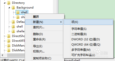 在注册表中,在 HKEY_CLASSES_ROOT\Directory\Background\shell 子键上右击鼠标,选择“新建”-“项”。