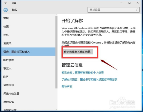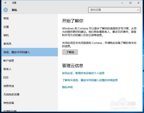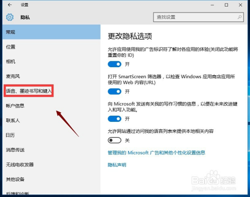 在隐私菜单列表中选择--语音,墨迹书写和键入选项,如下图所示