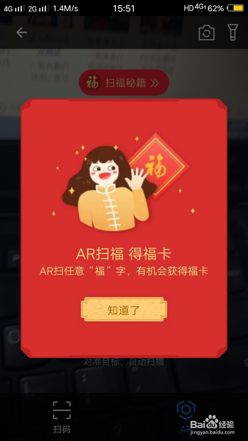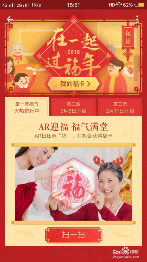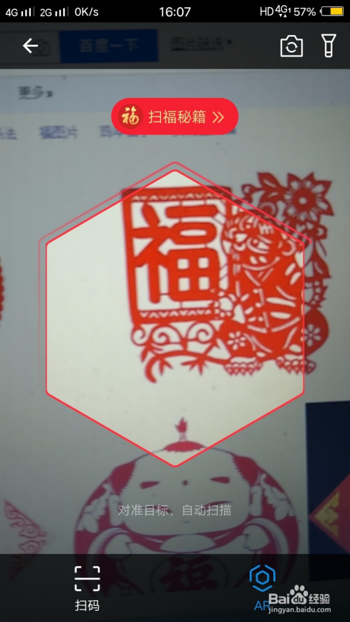 直接打开百度搜图,搜‘福’字,对准狂扫,然后就会扫除相应的福字卡