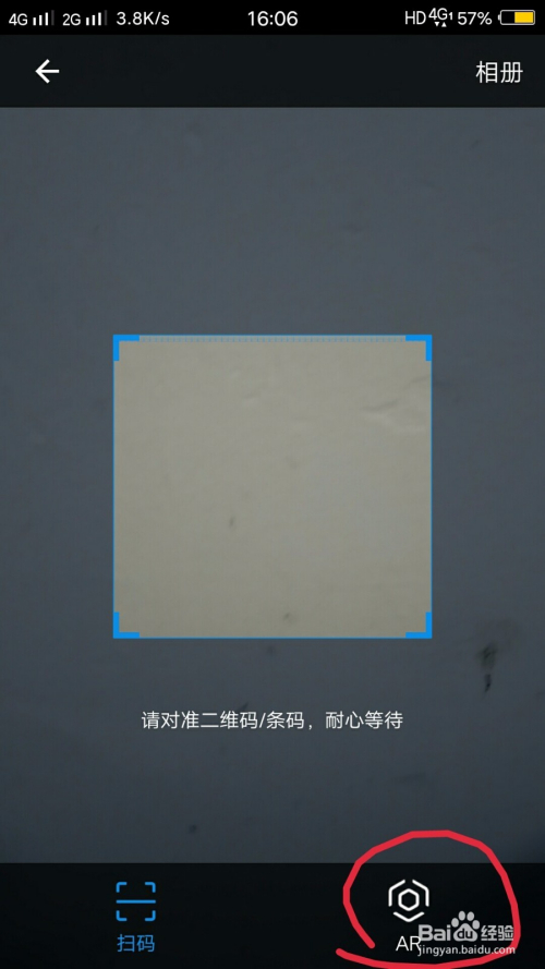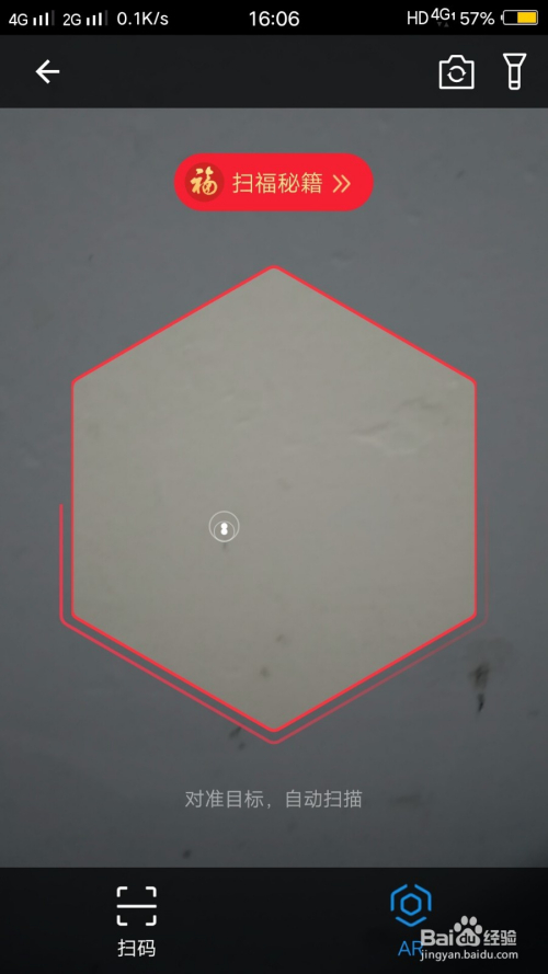 刚开始进入的时候是二维码扫描方形扫码框,我们点击右边的AR扫描,就会出现一个红色的六边形扫描窗口,对准福字扫描就可以了。