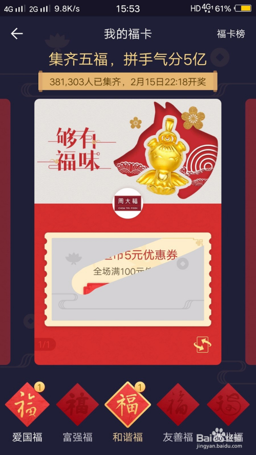 每张福卡的背后还有刮奖奖励,你可以点击刮奖获取不同的奖励。有些奖励就是可以直接消费抵现金的,还是比较好的