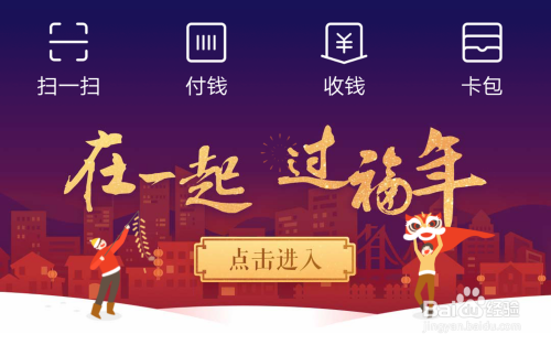 在完成支付宝版本的更新后,进入到支付宝的主页,在主页的上半部分有“在一起,过福年”几个字,点击这几个字下方的【点击进入】。