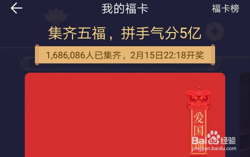 集齐5福后,在2018年2月15日22:18就可以进行开奖了。