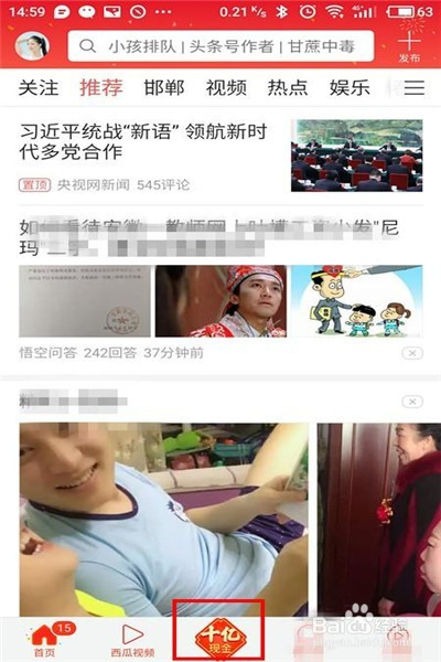 点击进入到今日头条,点击下方中间的”十亿现金“。