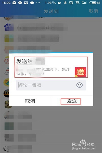 如果想要把生肖卡送给自己的QQ好友,和微信好友的送法是一样的,点击一下想送出的生肖卡,点击QQ ,找到好友,点击,再点击”发送“就可以了。