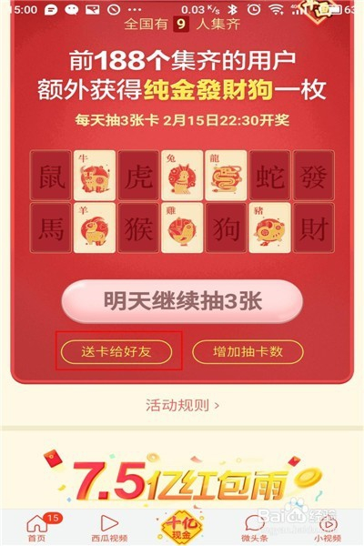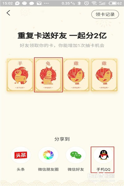 自己先把每天的三次机会抽取一下,这样才能有剩余的,自己不需要的生肖卡,点击一下”送卡给好友“。