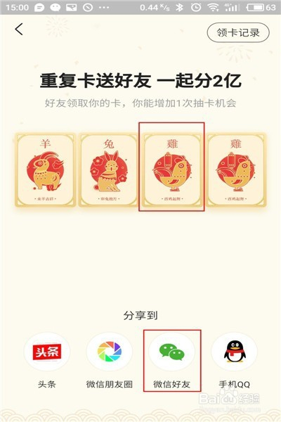 当然这里必须有剩余的卡,点击一下自己想要送出去的生肖卡,然后点击一下下方的微信或QQ,如果想送给微信好友就点击一下”微信好友“。