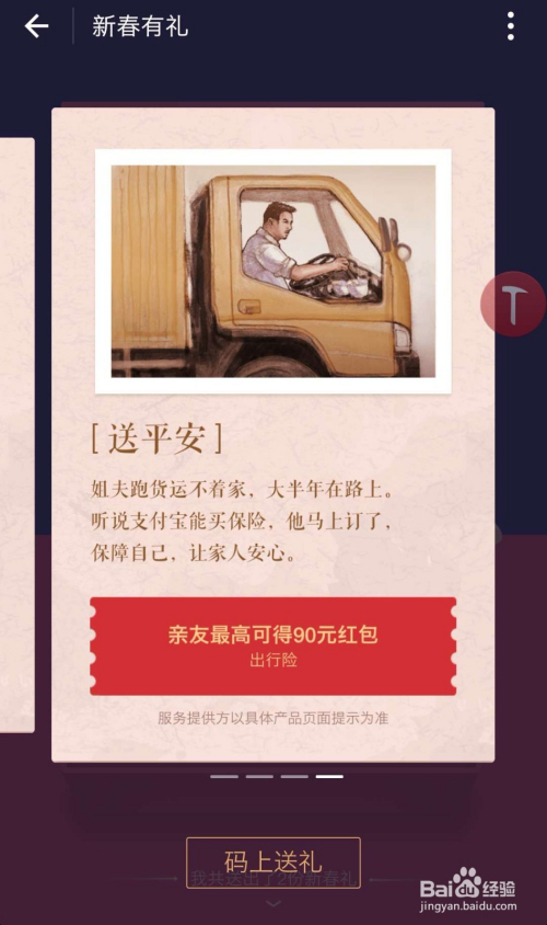 第四种就是送平安,亲友在外工作,家人都是期盼平安回家啊,所以啊这个扫码就是“出行险”啦!