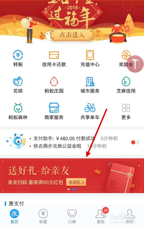 马上就要过年啦!支付宝不断出新花样,不但有一字千金发红包,还有集五福,还有一个就是隐藏的,因为小编感觉这个是各别人不是所有人。所以如果你打开支付宝看到有“送好礼给亲友”那你就是18年的幸运之星啦!接下来小编就具体来和大家分享一下。
