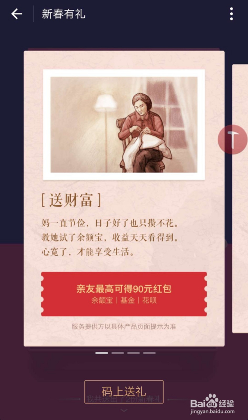 第一种是送财富,当我们选择送财富,点击进入后,下方就会有一个“码上送礼”,财富主要是指“余额宝”、“基金”、“花呗”这三种。