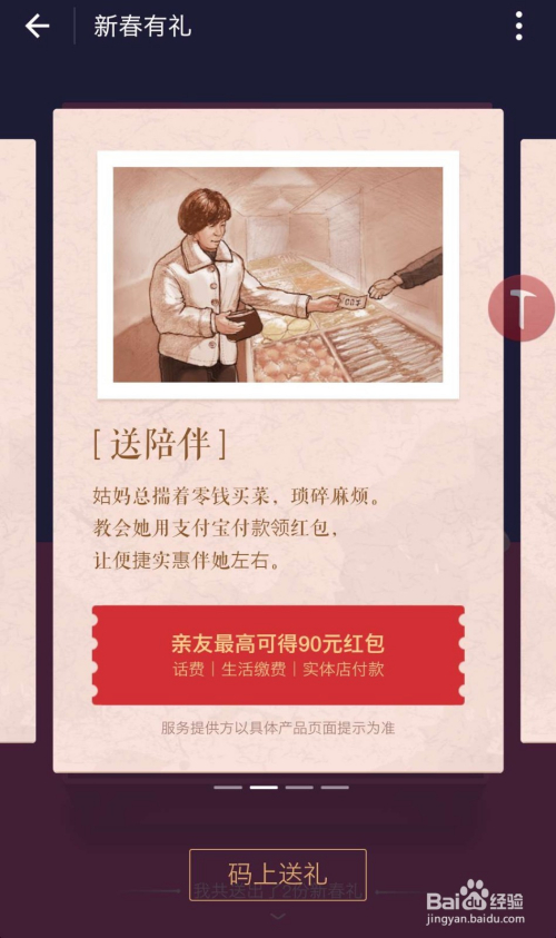 第二种是送陪伴,陪伴么就是多远都会有一个关心的话,这应该就是陪伴。主要扫码可能获得的礼品有“花费”、“生活缴费”和“线下支付”这些。