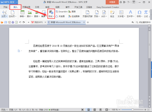 点击菜单栏的“插入”按钮,在弹出的二级菜单栏中选择“形状”。