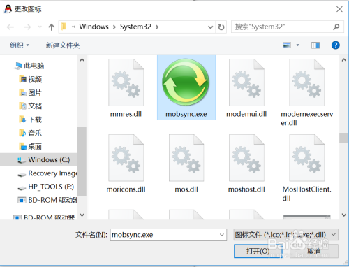 点击"浏览"之后,会出现一个文件夹,里面的图标你可以随便选择,要注意的是图标的后缀必须是“.DLL\.EXE.ICO”的。如果你要用自己的图标,必须要变成.ioc的格式。选择好之后点击“打开”
