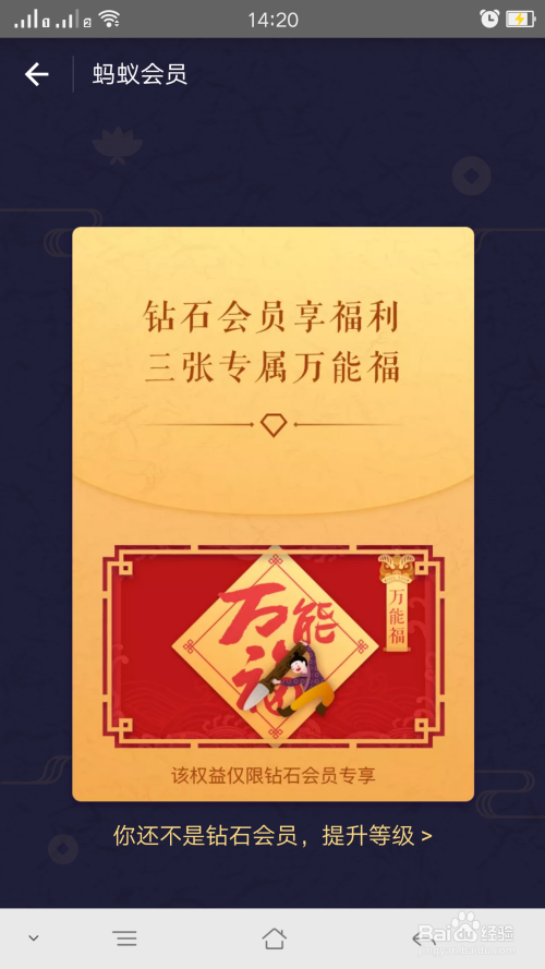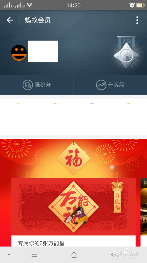 点击蚂蚁会员,进入到蚂蚁会员首页,这里显示专属你的3张万能卡,如图