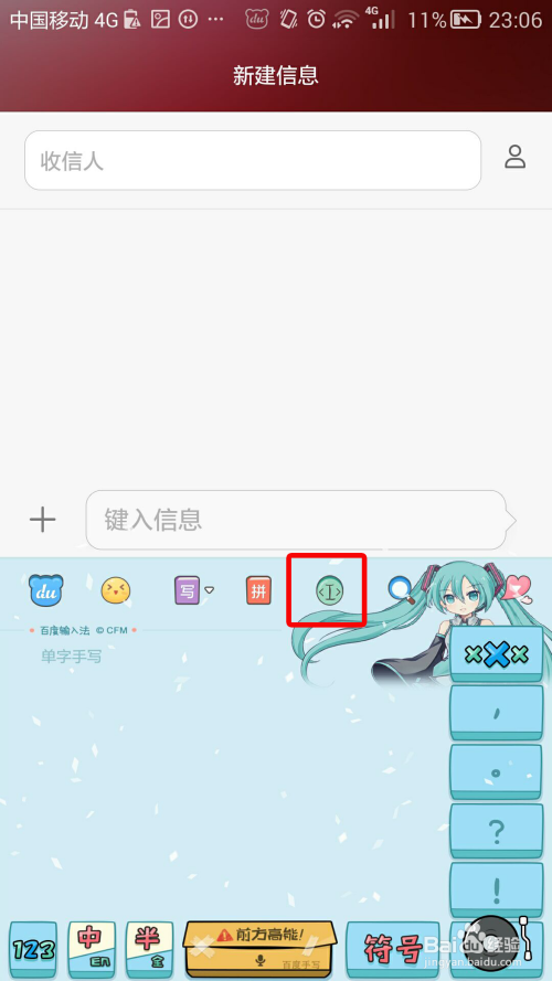 在新建短信里,把光标定在输入短信的内容这里,就会出现百度输入法点击【I】图标,如图所示;