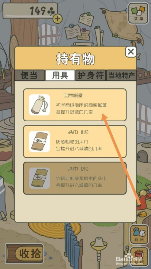 我们在“用具”点击自己想要的工具,楼主直接选择“自然帐篷”,如图所示,点击完毕后即可摆放完毕~ 我们再次点击“护身符”选项,开始摆放“护身符”~