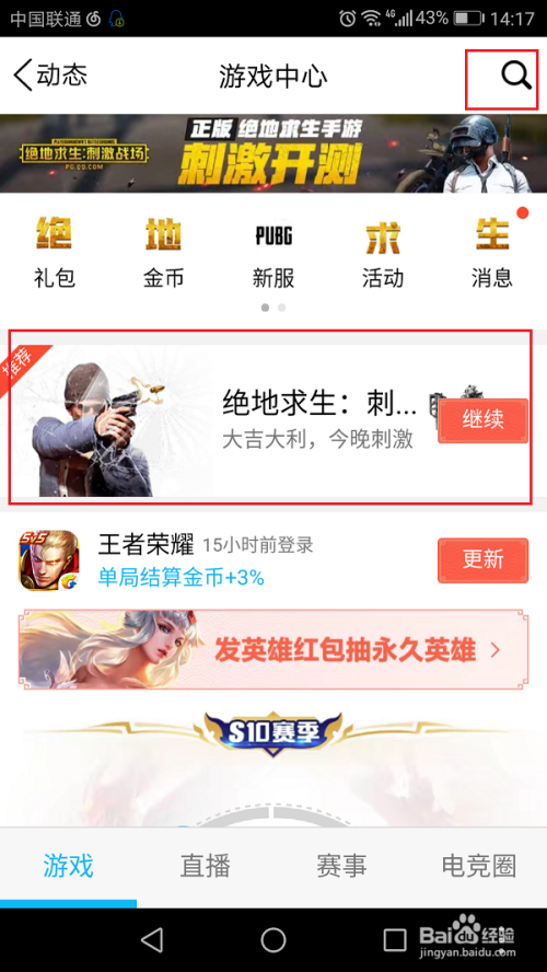 第三步进去游戏中心界面之后,可以直接看到绝地求生:刺激战场,点击下载,也可以点击右上方的搜索图标,搜索名称下载,如下图所示: