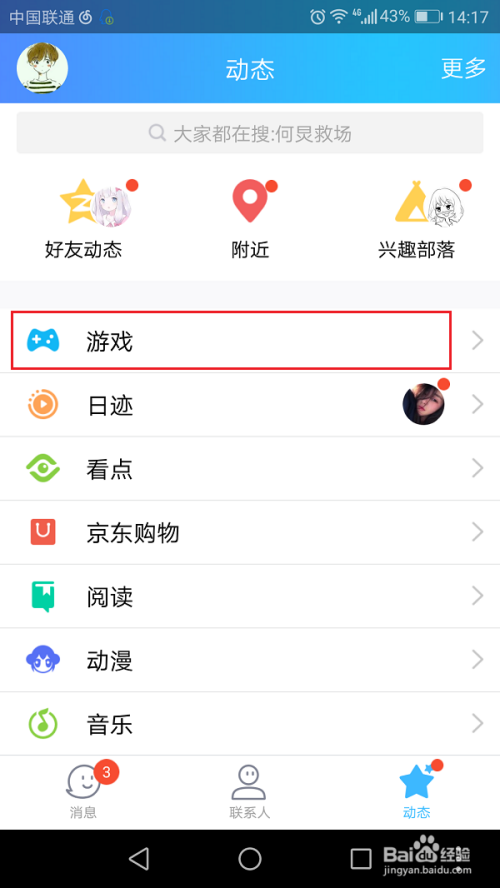 第二步进去应用之后,点击动态页中的游戏,如下图所示: