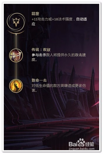 选择“精密”作为“副系符文”(强化攻击和持续伤害)。副系符文1里选择“欢欣”使艾快速A出三环;副系符文2里选择“致命一击”,加强对后排伤害能力。