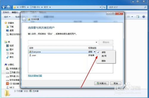 添加好用户名以后,在下方的对话框会显示出来,然后点击后方的权限设置“读取”“读/写”读取只能看,不能修改,读写可以做修改文档处理。