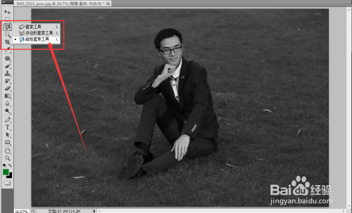 点击一下工具箱最下方的快速蒙版按钮,然后使用笔刷进行涂抹,为了达到精细的效果建议把图像放大几倍进行处理。