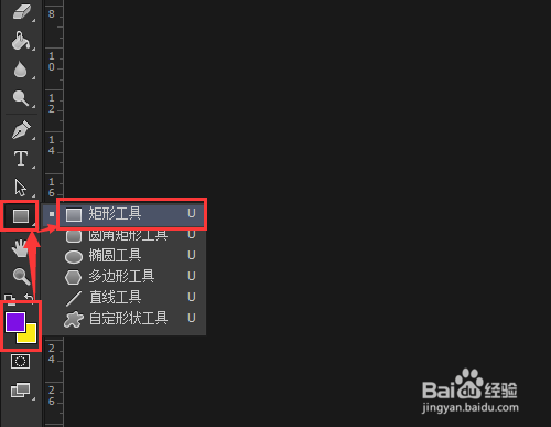 设置颜色,【前景色紫色】,【背景色黄色】,点击【矩形工具】。