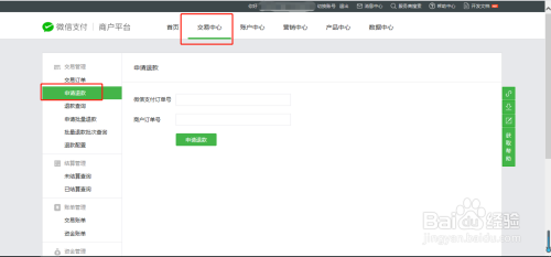 登录成功后,默认展示“首页”,选择“交易中心”下的“申请退款”,输入商户订单号或者微信支付订单号(二选一即可),填写完成后点击“申请退款”。