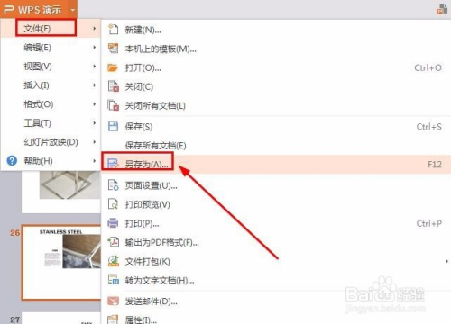 打开PPT文件,点击左上角的小三角下拉菜单文件--另存为