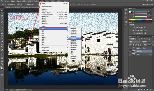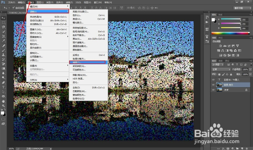 下面我们要频繁的使用的PS的滤镜功能了,如图所示,在滤镜--像素化--点状化