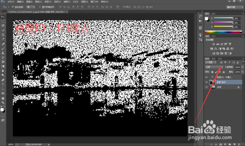 通过调整阀值色阶的参数值,发现黑白区域会有所变化,其实我们要的就是上边白色的点点,根据个人的效果需要来设置阀值的大小