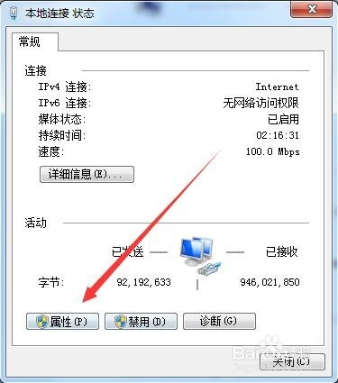 在打开的“本地连接状态”窗口中,点击窗口中的“属性”按钮