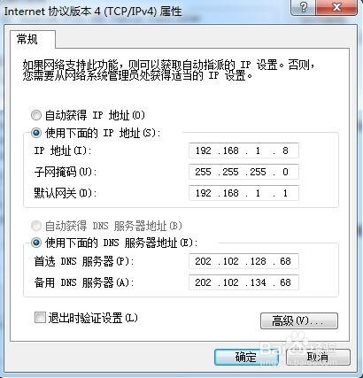 在打开的Internet协议版本属性窗口中,选择“使用下面的IP地址”,分别输入IP地址、子网掩码与默认网关,需要注意的是,IP地址与默认网关需与其它电脑在一个网段,同时IP地址是唯一的,输入完成后点击下面的“高级”按钮