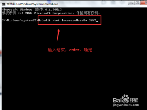 在系统运行界面里面system32>后面继续输入“Bcdedit /set IncreaseUserVa 3072”之后点击enter回车键确定修改成功。