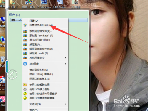 左键,点击桌面下方开始,在输入栏里输入“cmd”之后出现搜索结果,右键点击出现弹窗,点击以管理员身份运行(A)