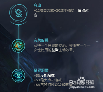 副系点选的是‘启迪’,‘完美时机’在前期小秒表保护自己,后面合成中亚都是不错的,‘星界洞悉’,提供全面的冷却缩减,并将冷却缩减上限提升到45%;