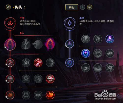 狗头这个英雄主要依赖前期的赖线和叠加Q的被动,达到既可以有着高伤害,又可以有一定的坦度,但是发育周期太长,很容易被针对,所以符文的选择很重要;符文推荐,主宰:3-2-1-1,巫术:3-1-0;
