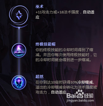 副系选择‘巫术’,‘终极技能帽’加快大招的冷却,‘超然’10级增加10% 的冷却缩减,让小技能可以更快的冷却;