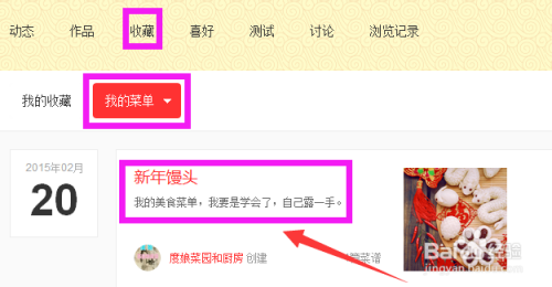 当看到一个自己喜欢的菜谱时,点击该菜单右侧的“收藏”。这个菜谱已经收藏过了,所以显示了已收藏。