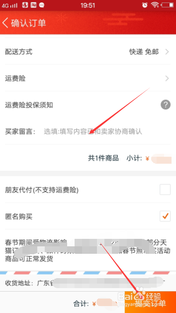 确认收货地址,没有收货地址就直接填上,需要备注的也可以写下来,比如要卖家发什么快递,这需要先跟卖家沟通好,确认卖家都有发哪些快递,确定无误后再点击“提交订单”。