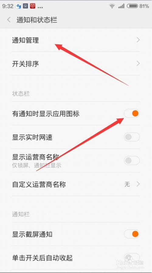 在通知和状态栏设置界面打开“有通知时显示应用图标”开关,然后点击“通知管理”菜单项。