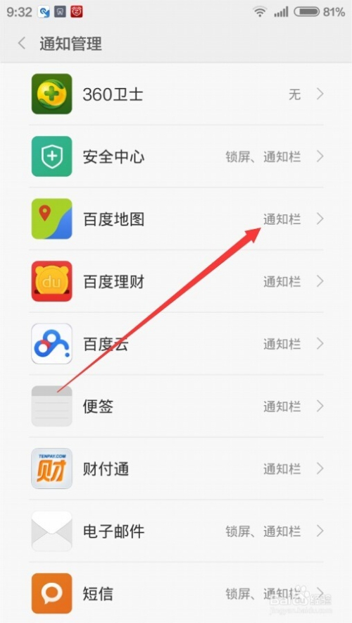 在打开的通知管理设置界面,就可以看到所有安装的应用程序了,我们以百度地图为例进行说明,点击百度地图的菜单项
