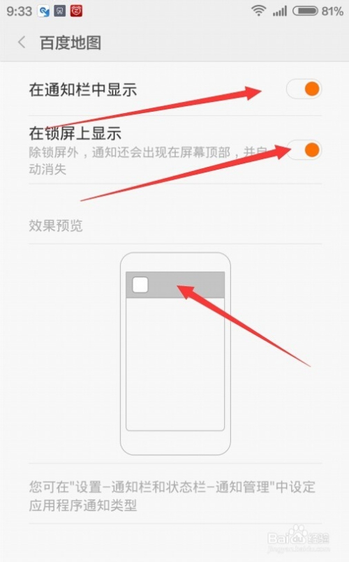 打开百度地图通知栏图标设置界面,如果想让图标在通知栏显示,只需打开“在通知栏中显示”的开关,在锁屏的时候有通知,也可以设置显示在屏幕顶端,只需要打开“在锁屏上显示”的开关即可。另外如果不想显示的话,只需要关闭该开关就可以了。
