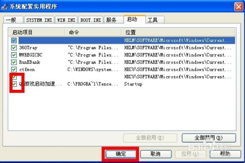 在系统配置使用程序页面点击“启动选项卡”,将不需要开机启动的启动项前面的勾去掉!点击确定。