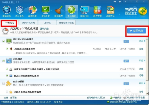 回到“一键优化”选项卡,点击扫描,扫面完成后点击“一键优化”按钮!完成优化后,系统服务和启动项都最精简了。速度会提升很多的。
